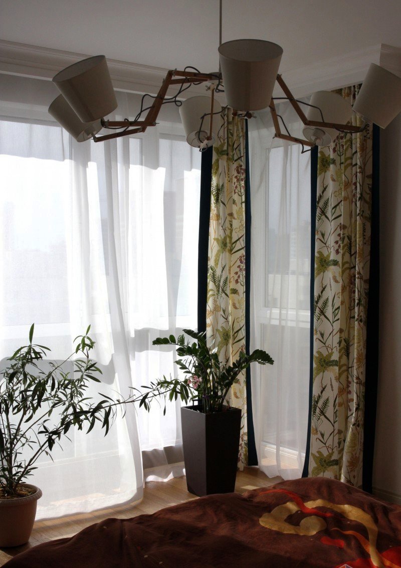В этот раз привлекают к себе внимание приборы освещения. В спальне это люстра-марионетка. Мне она почему-то очень напоминает Буратино. Плафоны можно направлять в разные стороны.