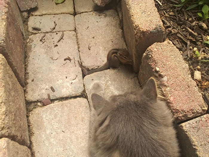 Трудно противостоять пушистому мягкому животику кошки и этот бурундук знает об этом. Отважное крошечное существо увидело пушистого кота принимающего солнечные ванны во дворе пользователя Reddit с ником GoldGuy и сделало прыжок, в надежде, что кошка не решит полакомиться им. Но кот не стал нападать на него или сопротивляться, что и стало началом их дружбы.