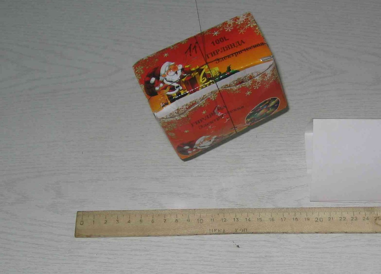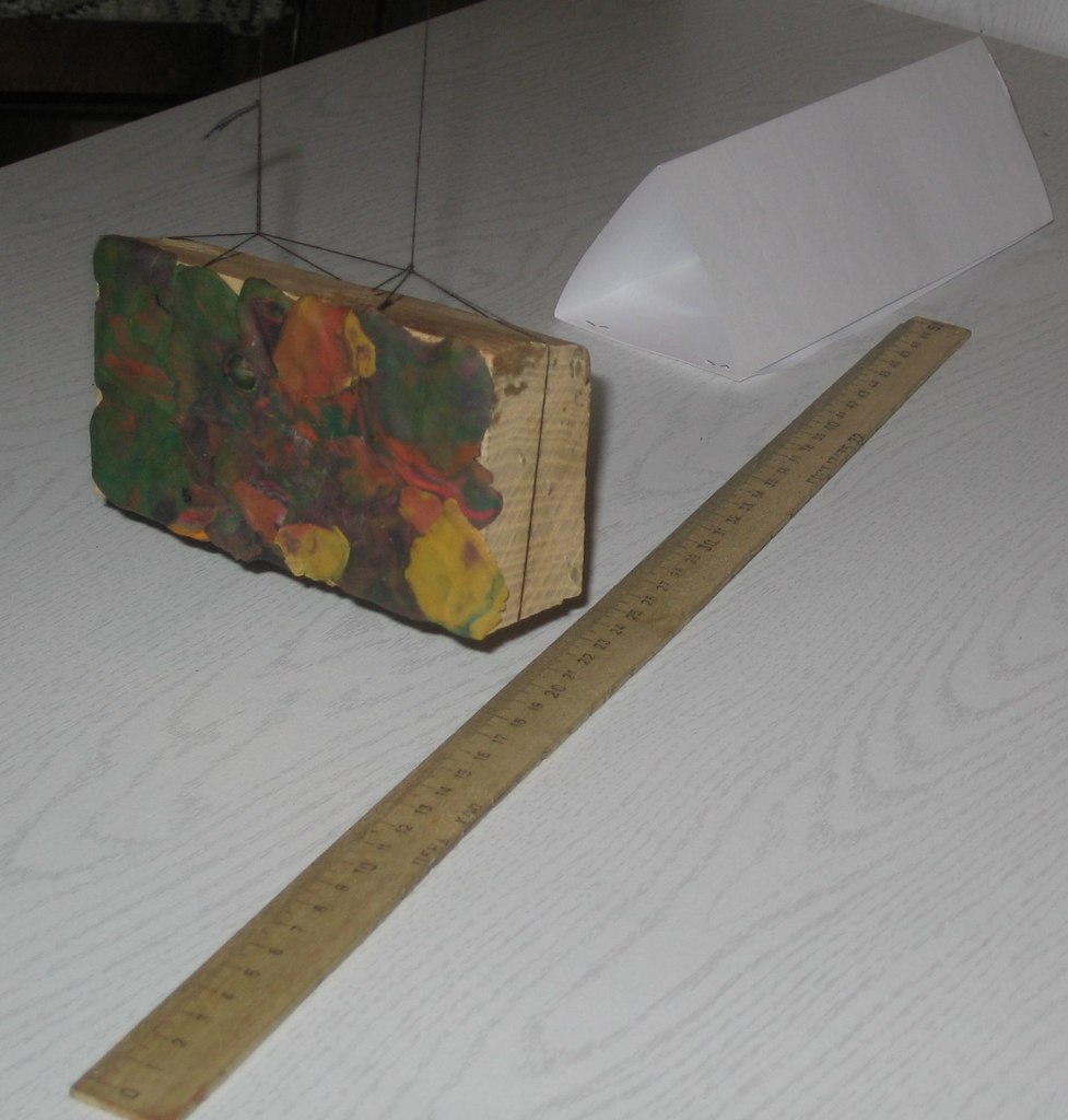 Логика подсказывает что нужно позаботиться о том, чтобы пуля не срикошетила от нашей мишени, иначе она не успеет передать ей всю энергию. Поэтому я решил сделать мишень из картонной коробки, а чтобы пуля не прошила ее насквозь, набить коробку тряпьем, в котором пуля увязнет. Чтобы отметить величину отклонения маятника, я придвинул вплотную к висящей мишени эдакую бумажную призму, а рядом с ней положил линейку, нулевую отметку которой выровнял с одним из краем призмы(фото 3). В теории бумажка должна остаться ровно там куда ее отодвинет маятник. На практике получалось что бумажка улетает несколько дальше. Я утяжелял маятник подсыпая ему внутрь картечь до тех пор, пока бумажка не повела себя как послушная девочка. Из расчетов получилось что скорость пули составляет 40,38 м/с, а "дульная энергия" - 2,69 Дж... Фигня какая-то. Получается что мощность рогатки меньше чем у игрушечной воздушки.