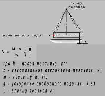 Обычно о мощности рогатки говорят что-то вроде: "Лупит выше девятого этажа", или "Колет бутылку из-под шампанского". В общем-то информативно, но как-то не научно. Я решил симпровизировать баллистический маятник. Все очень просто: подвешиваем некоторый грузик на длинной тонкой нитке и, хорошенько прицелившись, стреляем в него. Зная массу груза, пули, длину подвеса и величину отклонения по горизонтали после выстрела, по формуле можно рассчитать скорость пули (см. фото 1), а от скорости и массы пули - искомую кинетическую энергию.