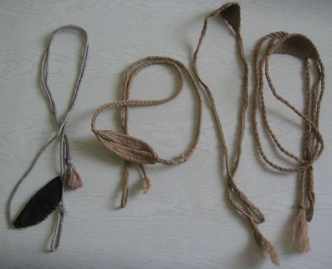 Две оставшиеся пращи - египетского типа, сплетены также из джута. Длины 40 и 95 см. соответственно. У короткой - тетивы сплетены косичкой, как и у перуанской, у длинной - в круглую витую веревку. Эта последняя мне нравится больше всего. Она вовсе не перекручивается как того можно было ожидать, гораздо мягче косички и вообще как-то по душе. К тому же из них обоих можно стрелять чем попало.