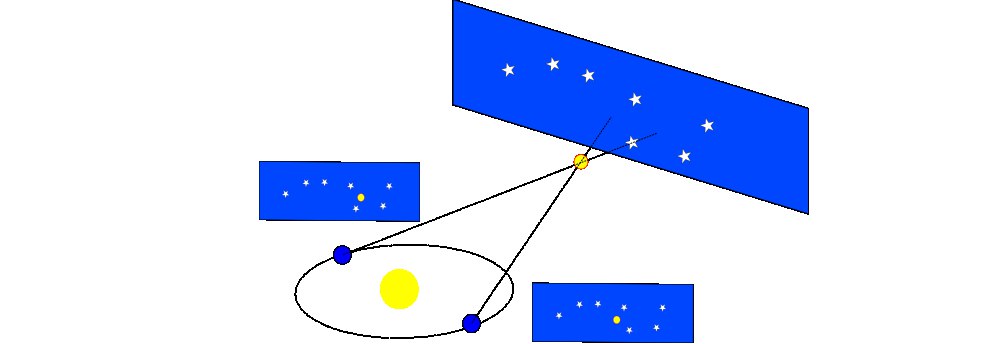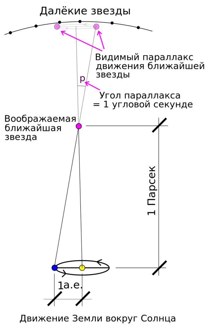 Собственно, параллакс (а это не только астрономическое понятие) представляет собой изменение видимого положения объекта относительно удаленного фона (в нашем случае более дальних звезд) в зависимости от положения наблюдателя. Используется он и в геодезии. Имеет значение для фотографии. Измеряется параллакс в угловых секундах (секундах дуги).