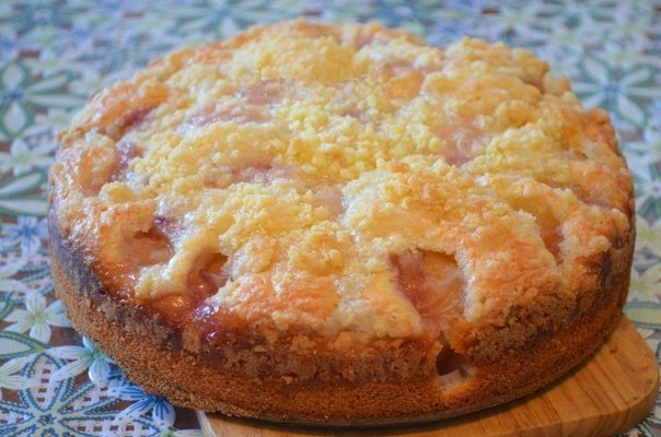 Тесто выложить в форму 20 см (лучше разъемную), сверху выложить персики, не вдавливая. Посыпать крошкой. Печь персиковый пирог при температуре 180 градусов 30-40 минут, смотрите по своей духовке. Готовность проверять зубочисткой. Готовый пирог остудить, достать из формы. Теперь можно нарезать на кусочки.
