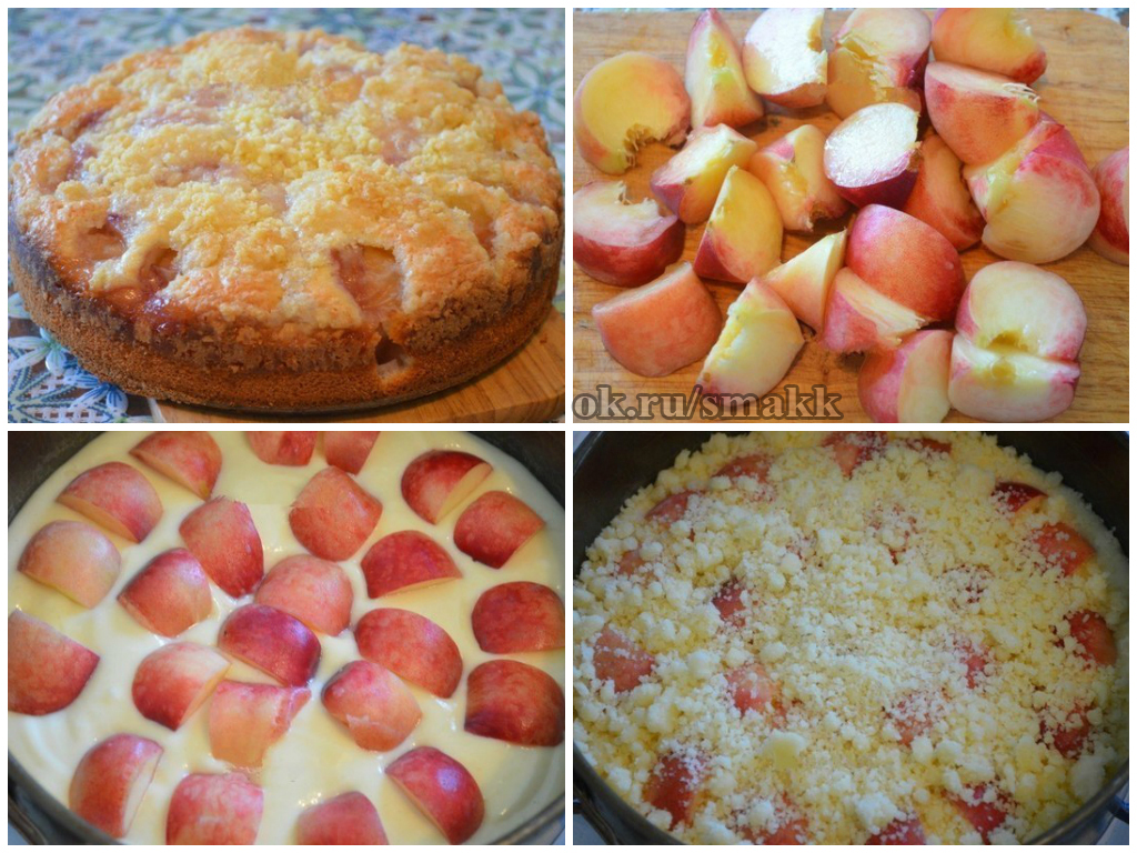 Сначала приготовим посыпку. Для этого в кастрюльке перемешать сахар и масло. Поставить на средний огонь и, после растворения масла, помешивать еще 1-2 минуты. Затем добавить муку, перемешать, огонь выключить. Выложить на тарелку, пусть остынет. Затем растереть в крошку. Яйца взбить с сахаром, ванилином и солью в течение 5 минут. Добавить сметану, снова взбить. Просеять в тесто муку с разрыхлителем, взбить. Персики помыть, удалить косточку, порезать на дольки.