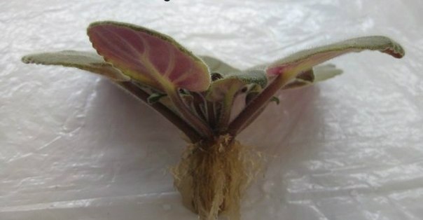 Через некоторое время на стебле розетки сенполии появляются корешки. Когда корни вырастают до 2 см, высаживают фиалку в свежую земляную смесь и помещают в тепличные условия. Вскоре укоренённое растение образует новые листья и выпускает цветоносы.