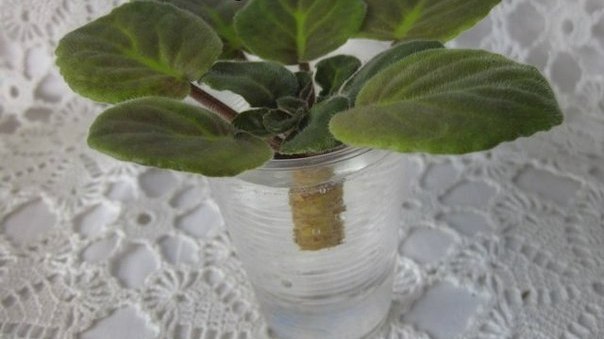 - помещают розетку растения в стаканчик с водой, так чтобы очищенный конец стебля был опущен в воду.