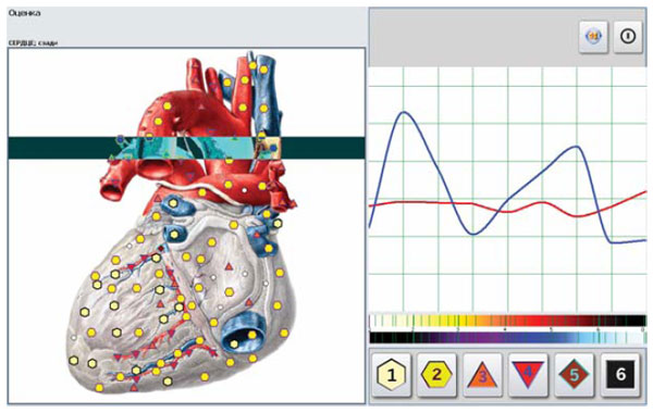 Суть диагностики проста: пациент садится перед экраном компьютера, в программу вводятся его жалобы, анамнез, результаты лабораторных исследований — в общем, вся имеющаяся медицинская информация. Затем на голову обследуемого надеваются наушники и запускается программа. Около 30−40 минут на экране мелькают картинки из базы данных, где специальными пиктограммами отмечены патологические очаги. Врачу, точнее оператору, как его принято называть, при этом вменяется в обязанность находиться от пациента на расстоянии как минимум одного метра, чтобы «не пересекались биополя».