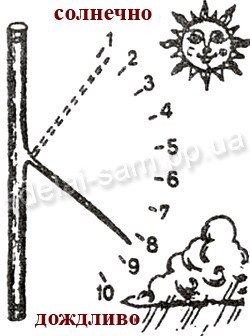 Для изготовления такого барометра необходим кусок ствола сухого небольшого деревца (длиной 25-30 см) вместе с веткой длиной 30-35 см. Ствол с веткой очищают от коры и прикрепляют к дощечке, которую вешают на стенку. При этом ветка должна располагаться так, чтобы при опускании-поднимании свободного конца ветки он перемещался параллельно стенке и не задевал ее. Поднятие ветки сигнализирует о ясной погоде, а опускание - к ненастью
