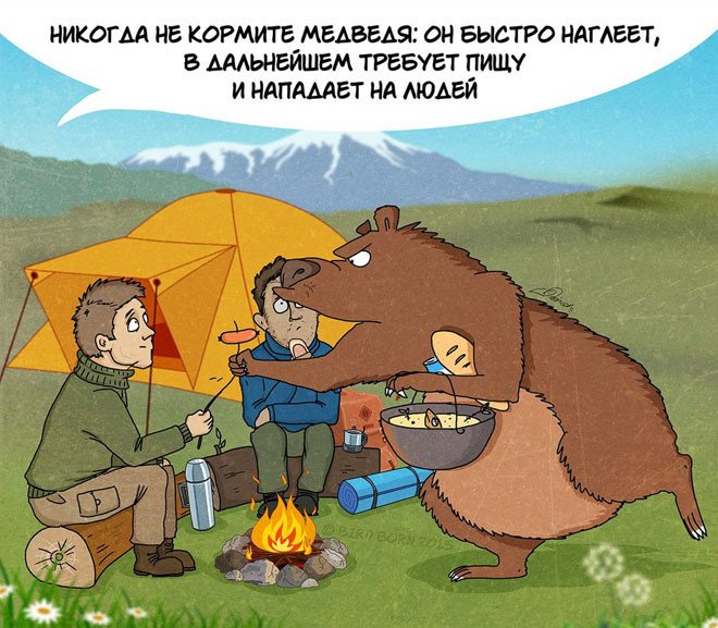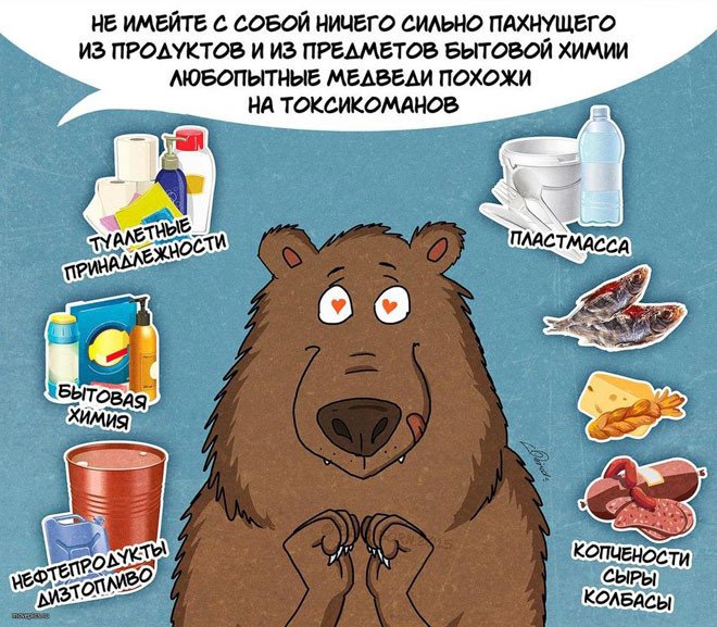 Иллюстрации в понятной и лаконичной форме объясняют, как избежать нежелательной встречи с медведем в дикой природе, и что делать, если эта встреча всё-таки состоялась.