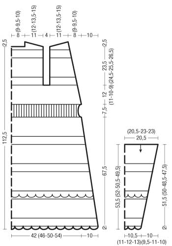 21,5 п. х 30 р. = 10 х 10 см, связано платочной вязкой пряжей 122 п. х 23 р. = 10 х 10 см, связано ажурным узором пряжей 2.
