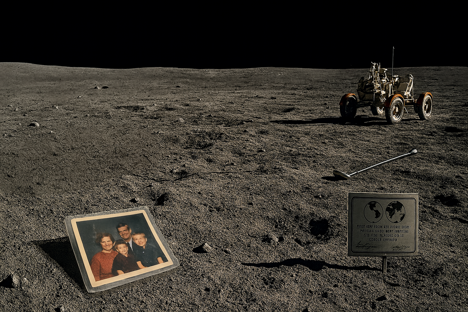 Чарльз Дюк с «Аполлона-16» взял с собой фотографию жены и двух сыновей. На обороте он написал: «Это фото важнее всех научных результатов». Снимок он положил прямо в пыль, и за полвека его никто не тронул. Возможно, первый, кто снова увидит это лицо на пожелтевшей бумаге, ещё не родился.