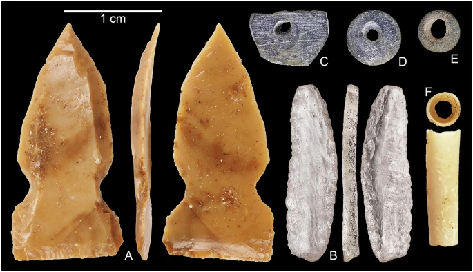 Артефакты, найденные во время раскопок: A. Каменный наконечник стрелы (тип «Эль-Хиам»). B. Небольшое каменное лезвие (тип «Хелуан»). C-E. Плоские круглые бусины из камня. F. Бусина, сделанная из морской раковины (денталиум).