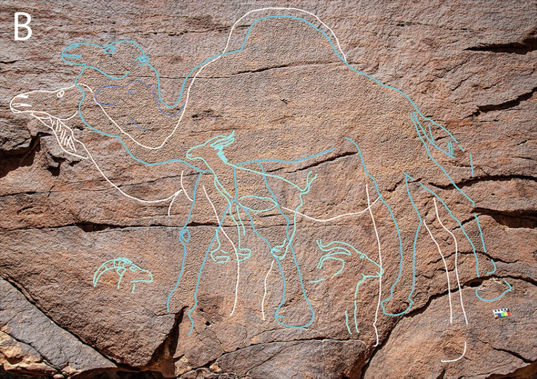 Иллюстрация показывает, как со временем менялся стиль изображений. Более ранние верблюды (этап 3, белый цвет) были реалистичными, с уникальными чертами. Позже поверх них высекали новых верблюдов (этап 4, синий цвет). Их стиль стал более схематичным и унифицированным: с характерными круглыми глазами и мордой. На нижнем изображении видно, как стилизованный верблюд (синий) перекрывает более раннего, реалистичного (белый). Новые изображения были также крупнее старых: их длина достигала 2.6 метра.