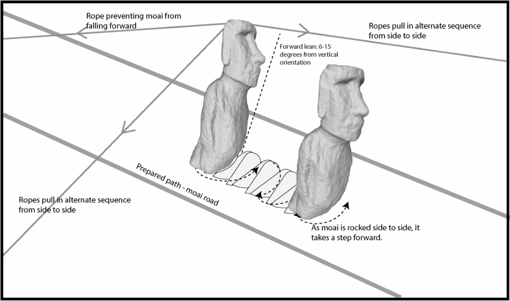 Долгое время думали, что статуи клали на бревна и тащили. По этой теории, ради бревен, жители острова срубили все деревья, что привело к порче земли, голоду, и их общество погибло.