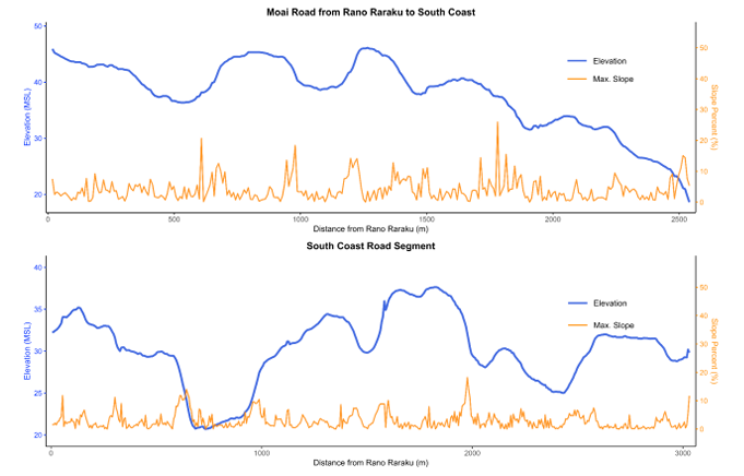 Эти дороги идут по холмам, и на некоторых кусках большой уклон, до 20-25%. Перевозить что-то тяжелое горизонтально по таким холмам было бы очень трудно. Был бы большой риск, что груз соскользнет. «Шагающую» же статую по таким склонам протащить было гораздо проще.