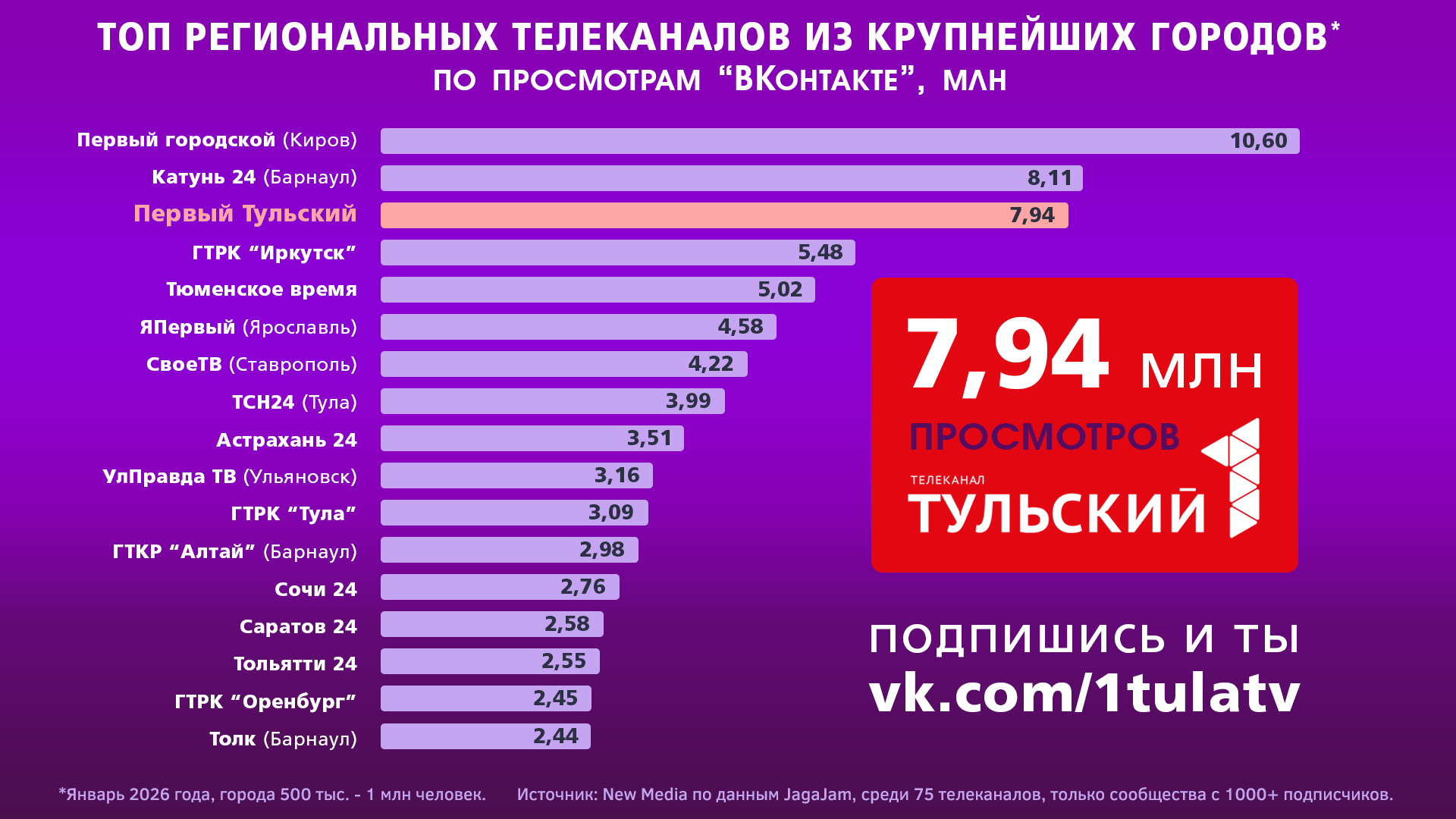 Телеканал "Первый Тульский" в январе 2026 года набрал почти 8 миллионов просмотров в социальной сети "Вконтакте". Такие данные предоставляет New Media.